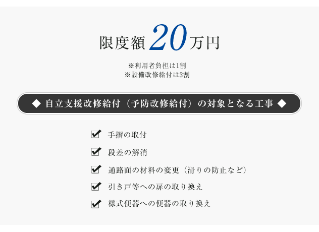 65歳以上の、介護保険の要支援・要介護認定の対象とならない方で、日常生活動作に何らかの困難があり、改修が必要と認められる方を対象とする、練馬区の現物給付制度です。